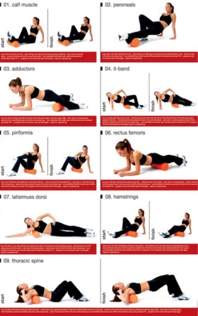 You can roll out pretty much every skeletal muscle you have, if you have the right roller. Again, what is right for you and a certain muscle group may not be the same for another. When foam rolling, give it enough time. Just like stretching, don’t rush through foam rolling. Give each muscle group a minute or so. Roll all the way up and down the muscle. Remember to breathe through it and keep muscles as relaxed as possible. If you find a spot in the muscle that is a little extra tender, keep the foam roller on that spot for a couple seconds. I have attached a document on the next page that has examples on how to roll out different body regions.